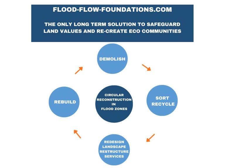 Pour les « inondations douces » causées par la remontée des nappes phréatiques ou le débordement des rivières, les habitations peuvent être construites sur des fondations surélevées, permettant à l’eau de circuler et d’être absorbée naturellement. Les routes doivent être perméables, et l’aménagement paysager doit tenir compte des flux d’eau et d’autres facteurs logiques pour réduire les dégâts et les coûts. De nombreuses rivières ont été détournées pour des raisons économiques et doivent retrouver leur cours naturel.