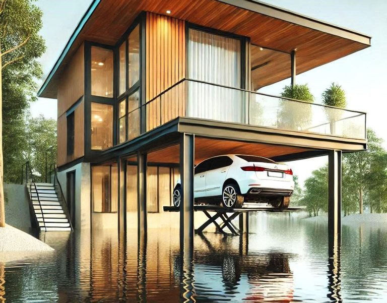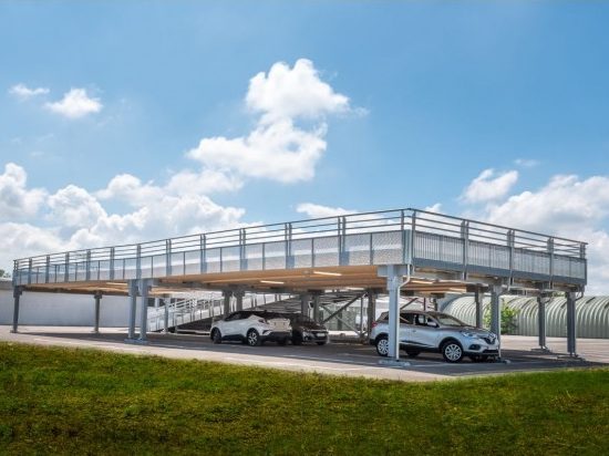 Stationnement surélevé autonome pour installation dans les zones inondables.